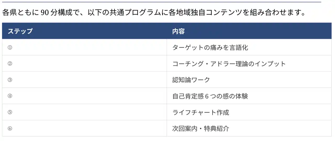 以下の共通プログラムに各地域独自のコンテンツを組み合わせます。 |