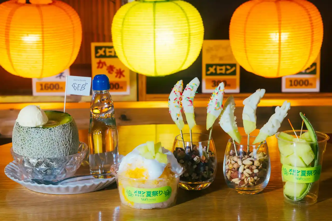 | 夏祭りの定番屋台メニューを茨城らしくメロンでアレンジしました。カットしたメロンとホイップクリームを盛り付けた「ごろっとメロンかき氷」やホワイトチョコレートとの相性が抜群の「チョコメロン」、ドリンクにはメロンの器にラムネを注いだ「メロンまるごとラムネ」などを提供します。特に「メロンまるごとラムネ」は、上部をカットしたメロンを贅沢に器にし、昔懐かしいラムネを注いだインパクト抜群の一品。シュワシュワの炭酸と甘い果肉を豪快に味わう、大人のための贅沢な屋台メニューです。 | |||||||||