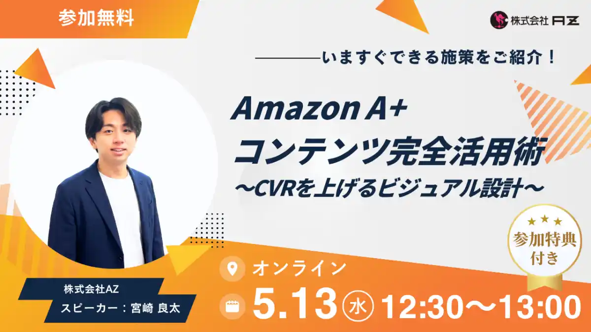 株式会社AZ(本社:大阪市中央区本町、代表取締役社長:藤堂 高義)は、2026年5月16日(水)12:30から【Amazon A+コンテンツ完全活用術~CVRを上げるビジュアル設計~ウェビナー】をオンラインで開催いたします。 |