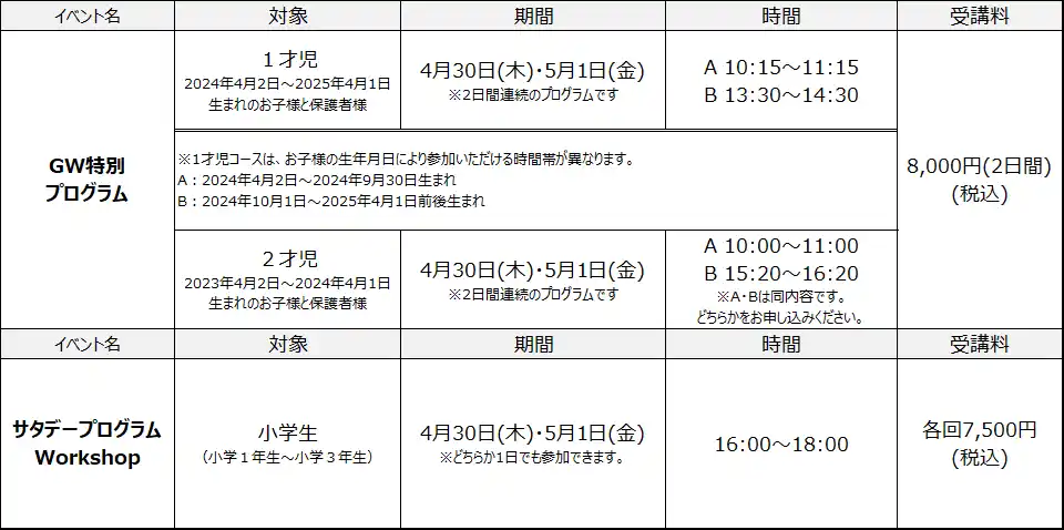 | 1才児・2才児「GW特別プログラム」 | |||||||||||