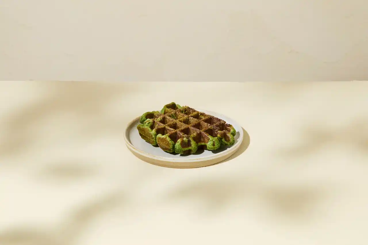 ワッフル」の抹茶フレーバー。北海道産小麦とバターをベースにした生地に、厳選した抹茶を練り込みました。使用する抹茶は、カフェでご好評いただいている抹茶ラテにも使用している京都の老舗茶問屋「利招園茶舗(りしょうえんちゃほ)」のラインアップから、ワッフルとの相性を考えて選んだもの。ほど良い苦味と抹茶ならではのコクが調和した、バランスの良い味わいが特徴です。バニラペーストのやわらかな香りとシーソルトのほのかな塩味が抹茶の風味を引き立て、上品で奥行きのある甘さに仕上げました。