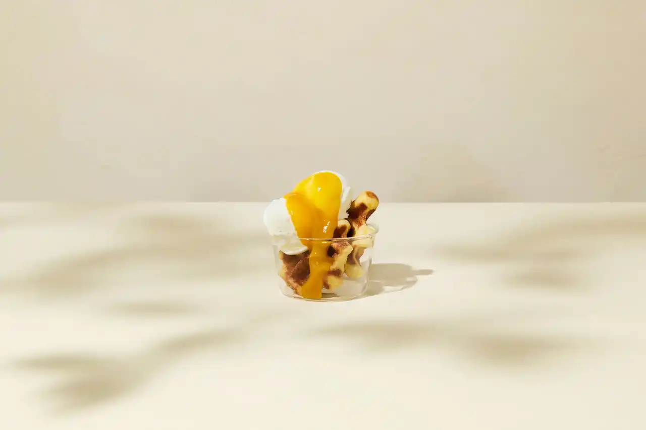 少しずつ太陽の日差しが眩しくなる季節にぴったりのワッフルパフェが、全国のカフェに先駆けて鎌倉カフェに登場いたします。ご注文をいただいてから焼き上げたリエージュ ワッフルに、北海道・美瑛産牛乳の甘みとすっきりとした味わいが特徴である「HiO ICE CREAM」の美瑛シングルオリジンミルクアイスをトッピング。仕上げにマンゴーピューレを使用した濃厚なソースをたっぷりと添えました。あたたかいワッフルと冷たいアイス、そしてとろりとしたマンゴーの果実味が重なり、温度が変化するにつれて味わいの変化もお楽しみいいただける一品です。ぜひ鎌倉カフェで初夏の訪れを感じながらお楽しみください。 |