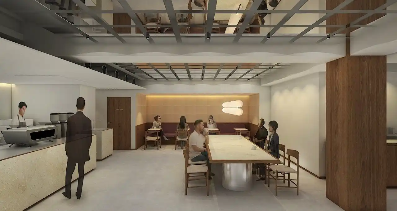 鶴岡ミュージアム(旧神奈川県立美術館鎌倉館)のピロティー天井にきらめく蓮池水面の光と影から着想し、日本建築の伝統的な様式である格天井のように均一に吊り込みました。照明や壁の一部にはコーヒーで染めた和紙を使用し、ソファには初夏の鎌倉を代表する紫陽花カラーのファブリックを採用しました。落ち着いた印象のウォールナット素材を随所に取り入れ、リラックスした空気感の中で古都鎌倉の趣を感じながら、ゆったりとコーヒーをお楽しみいただける空間に仕上げました。