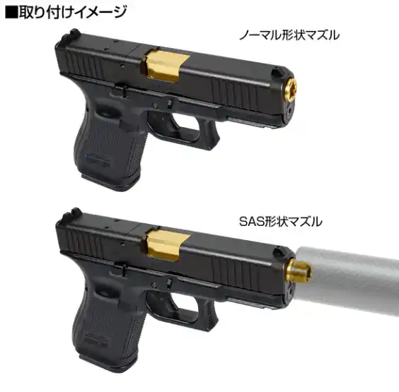 マズル先端はノーマル形状と14mm逆ネジ形状の2種類が付属。用途や好みに応じて選択が可能です。14mm逆ネジ対応の各種アタッチメントに対応しており、トレーサーやサプレッサーなどの装着もスムーズに行えます。 |