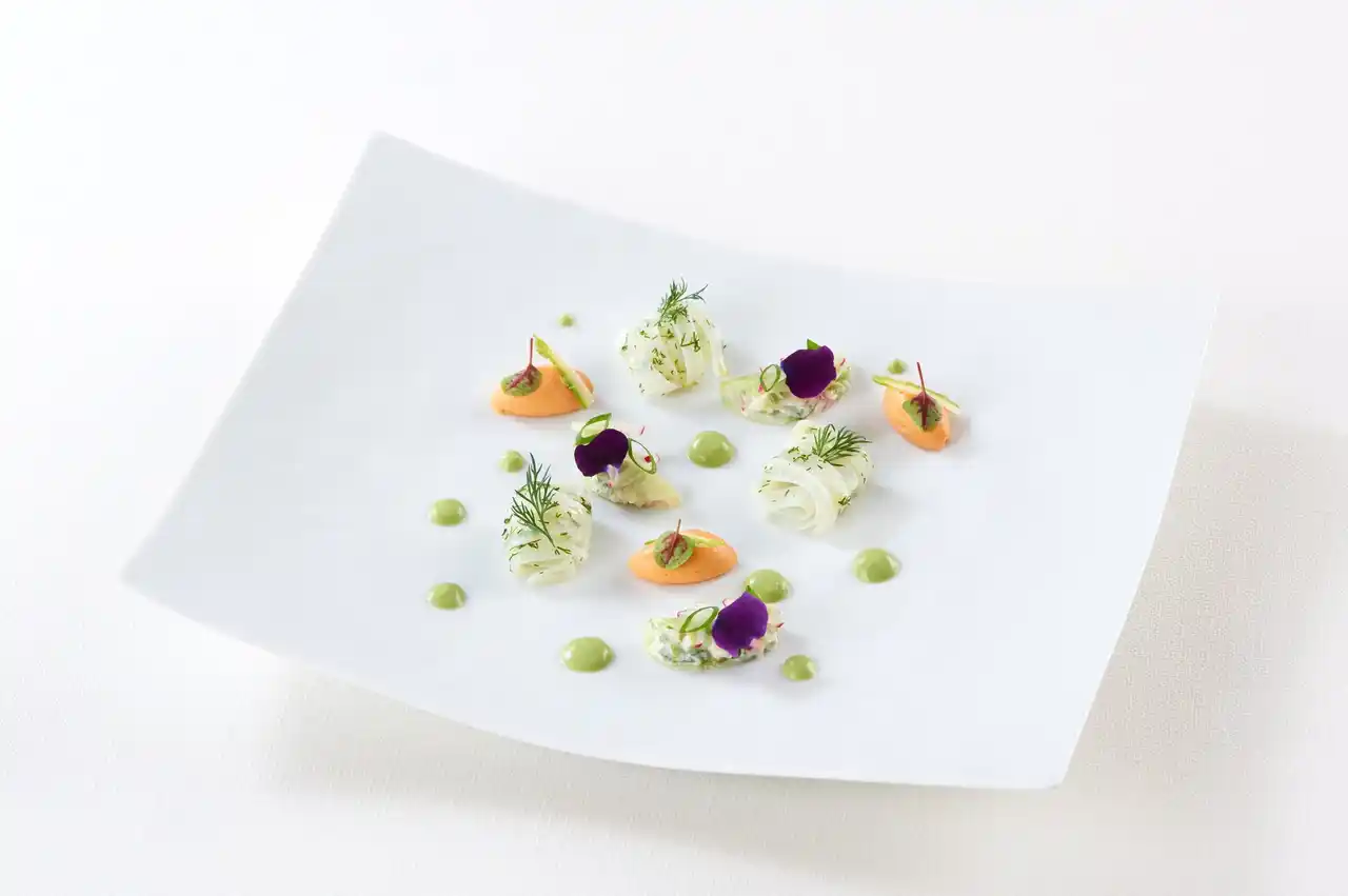 | 水面を走る光の粒、風にそよぐ柔らかな若葉、そして水辺で語らう人々の穏やかなひととき―。エグゼクティブシェフ ルノー・オージエがキャンバスに見立てた皿の上に、旬の食材を用いてながらその情景を描いたのが『Au bord de l'eau ~初夏の水辺~』。一皿ごとに、みずみずしい季節の素材と繊細な味わいを感じられ、日常を離れた優雅な初夏へと誘います。 | ||||