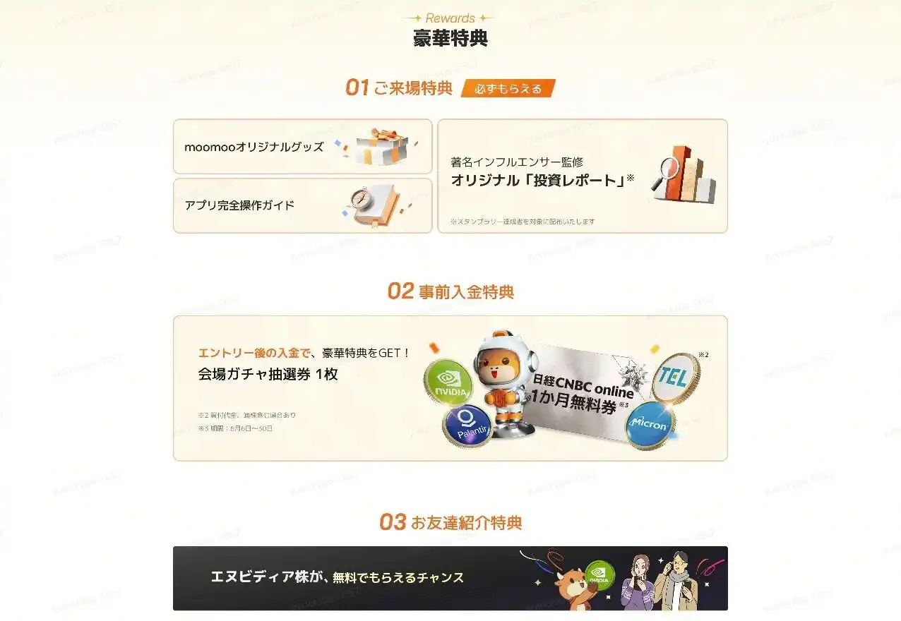 来場登録のうえ当日お越しいただいた方には、moomooオリジナルグッズやアプリ完全操作ガイド、著名インフルエンサー監修「オリジナル投資レポート」を差し上げます。 |