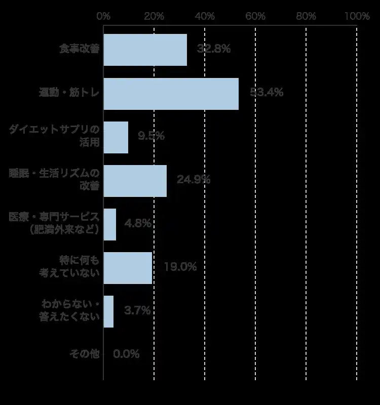 運動・筋トレが半数をこえ、食事改善と睡眠が続いています。複数を選択している人が少ないのも特徴でした。 |