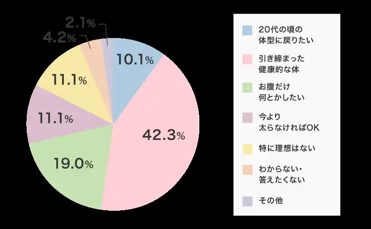 理想の自分の姿に一番近いのは「引き締まった健康的な体」が4割をこえ、次に多かった「お腹だけはなんとかしたい」の2倍以上になりました。 |