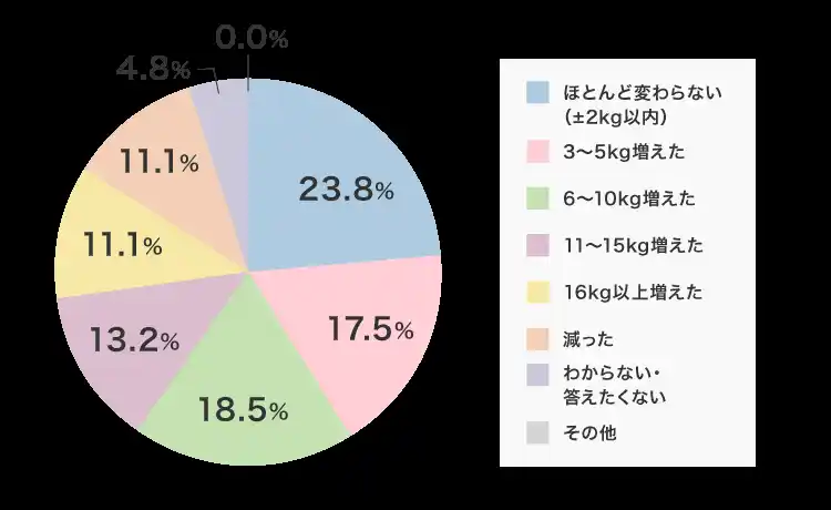 ほとんど変わらない+減ったという回答は3人に一人と少数派。16キロ以上増えた人は11.1%もおいででした。 |