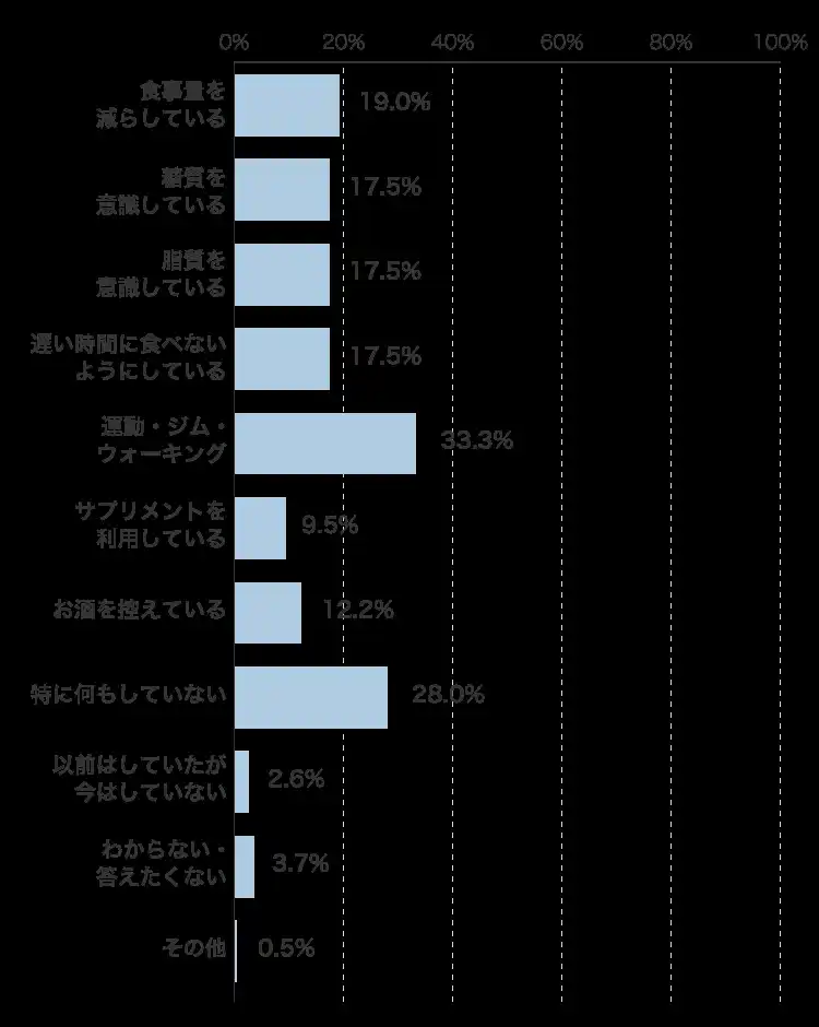運動派は3人に一人。一方、何もしない人もそれに近い回答に。サプリメントの利用は予想以上で9.5%でした。 |