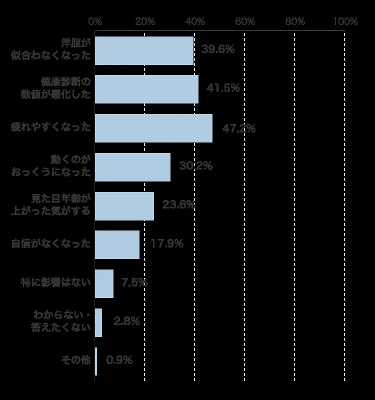 半数近くの方が体型変化で「疲れやすくなった」と感じています。「自信がなくなった」という回答が多いのも気になります。 |