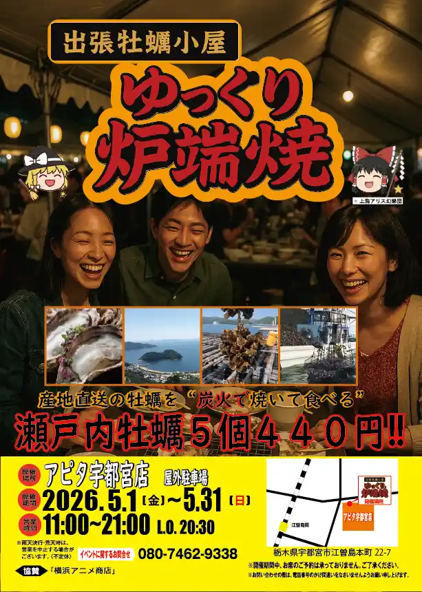| 瀬戸内産牡蠣、 赤穂産牡蠣、 石巻産牡蠣など各地で水揚げされた牡蠣を産地直送でお届け!! ゆっくり炉端焼き実行委員会 (080-7462-9338) 5月1日、 アピタ宇都宮店 屋外駐車場 特設会場 (栃木県宇都宮市) にて期間限定オープン。 開催期間は、 5月1日 (金) から5月31日 (日) | |||||||||||||