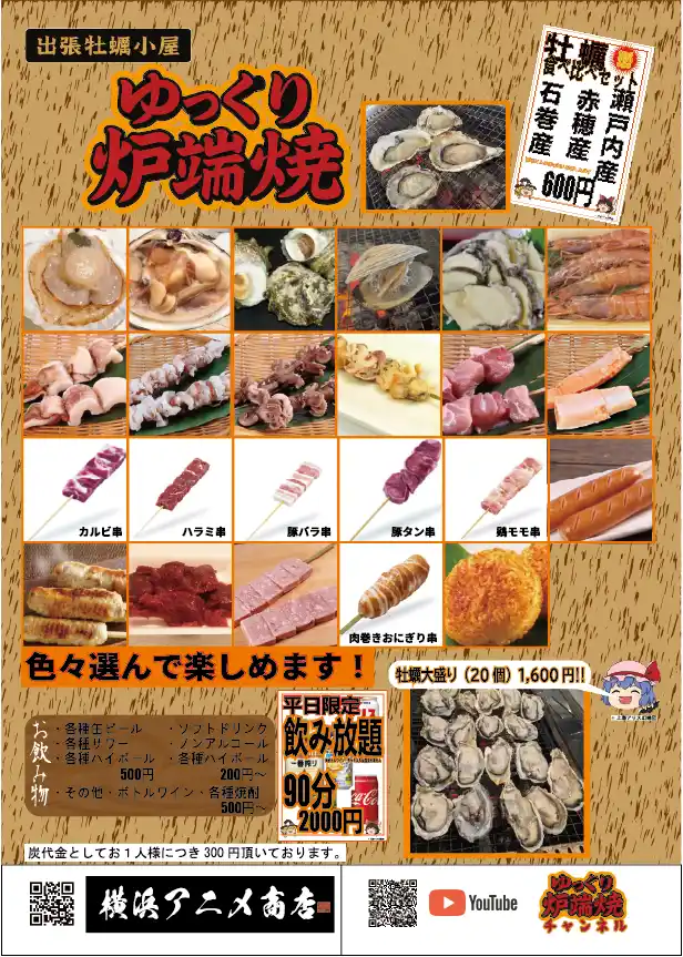 | 海鮮・お肉・ごはん・お菓子など30種類を超える豊富なメニューをご用意しています。 中でも、 能登半島産のサザエ・房総半島産のホンビノス貝・青森産の北寄貝など味と産地にこだわった 厳選食品を炭火で食べることが出来ます | |||||||||||||