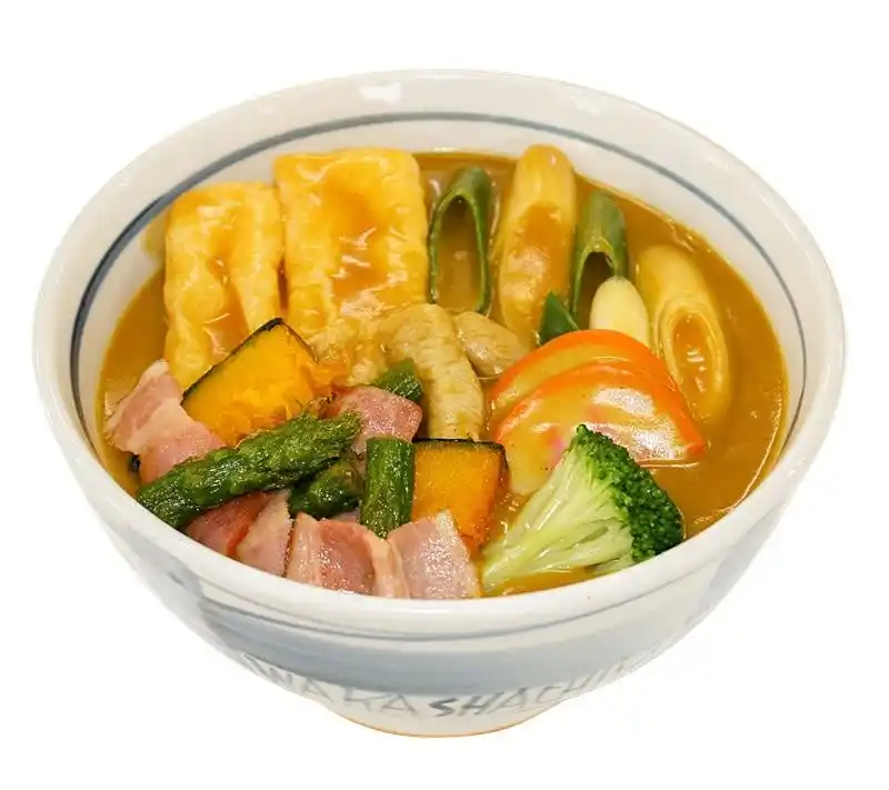 素揚げしたかぼちゃ・アスパラ、ベーコン、ブロッコリーをトッピング。味・彩り・食べ応えすべて満点のコラボカレーうどん。 |