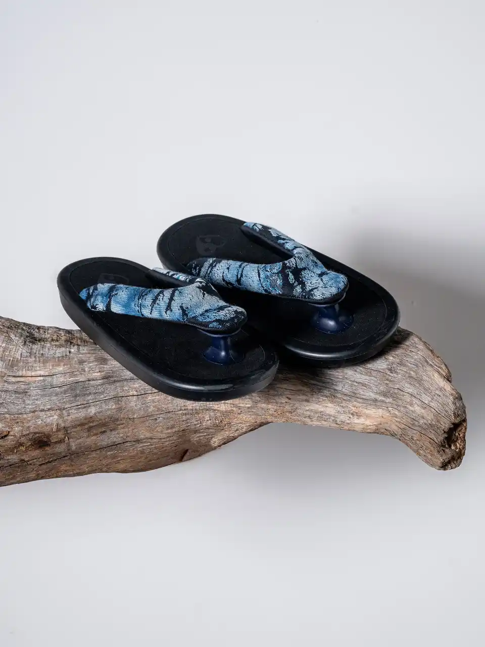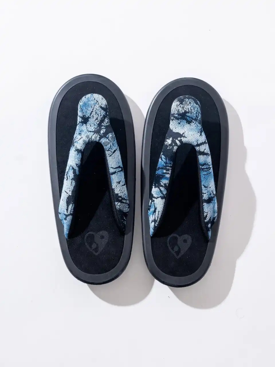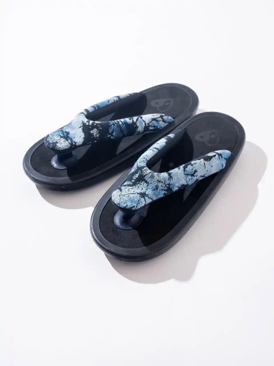 インディゴ絞りによるガラスパターン生地と、草履由来の構造を掛け合わせた特別仕様です。日常使いに適した実用性と、落ち着いた存在感を兼ね備えた一足に仕上げています。 |