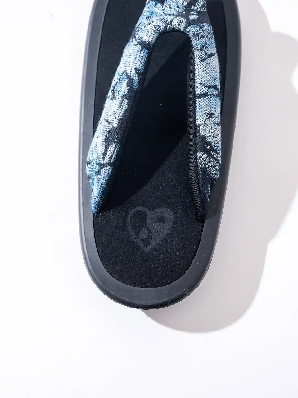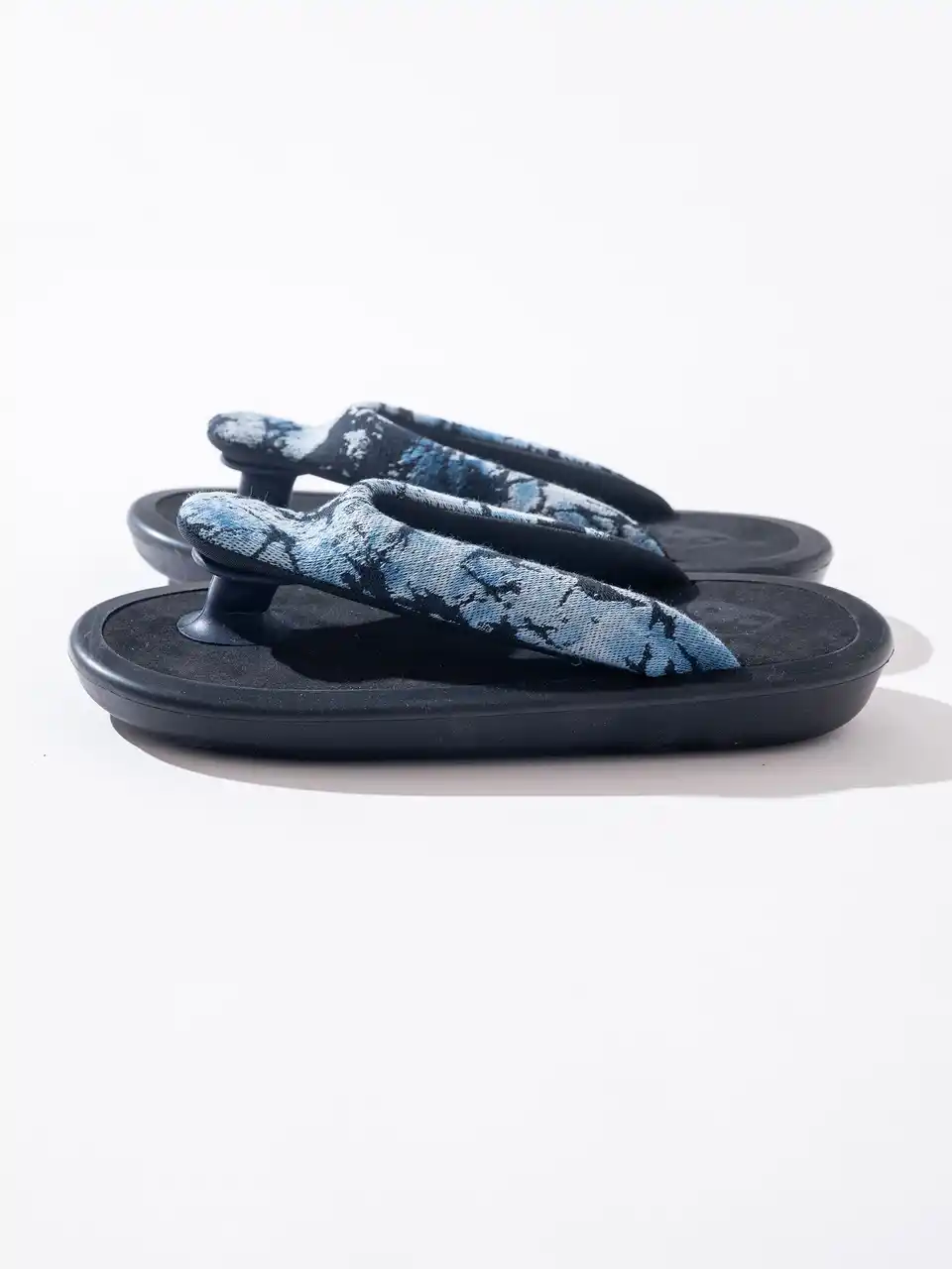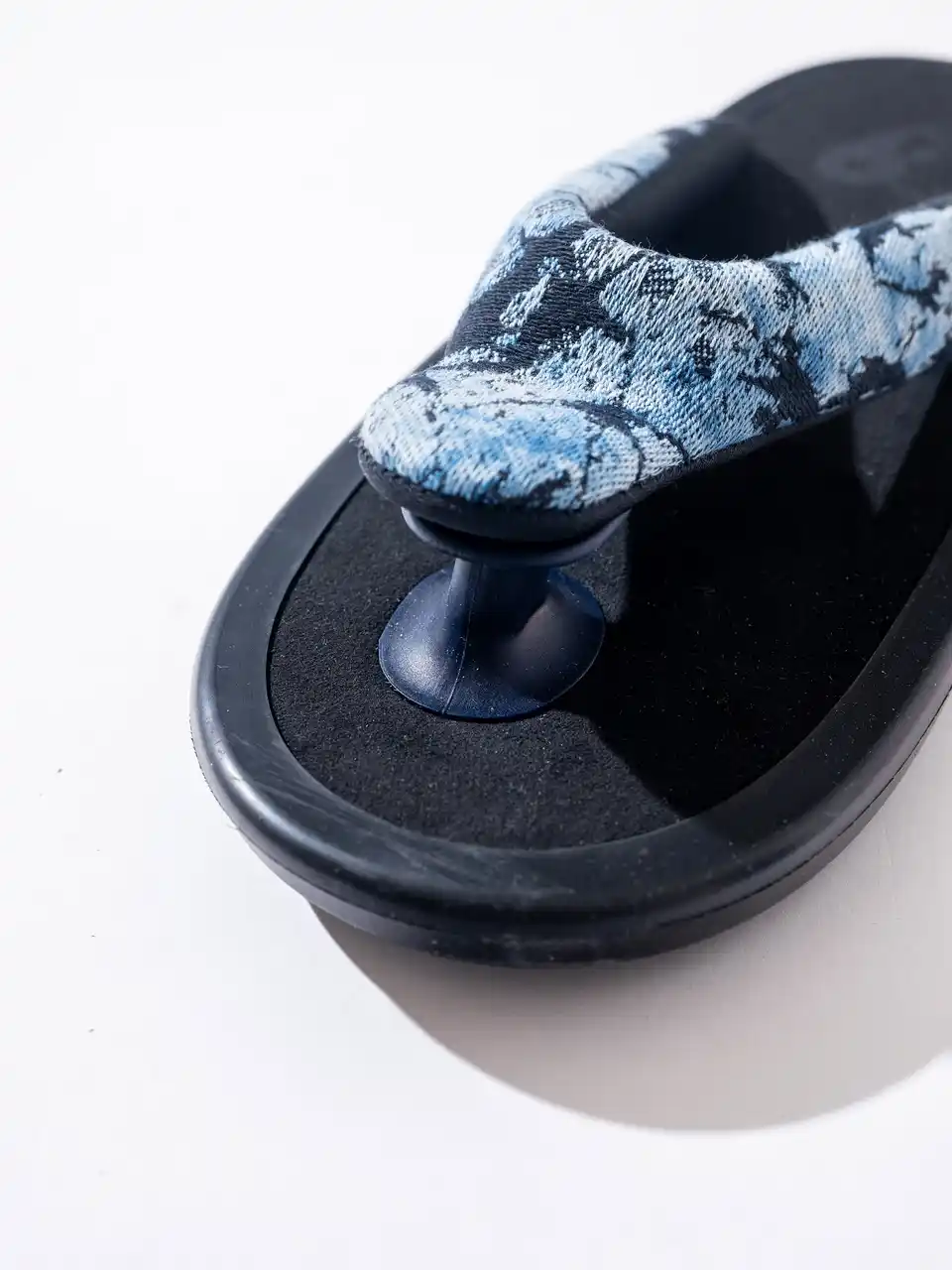 インディゴ絞りによるガラスパターン生地と、草履由来の構造を掛け合わせた特別仕様です。日常使いに適した実用性と、落ち着いた存在感を兼ね備えた一足に仕上げています。 |