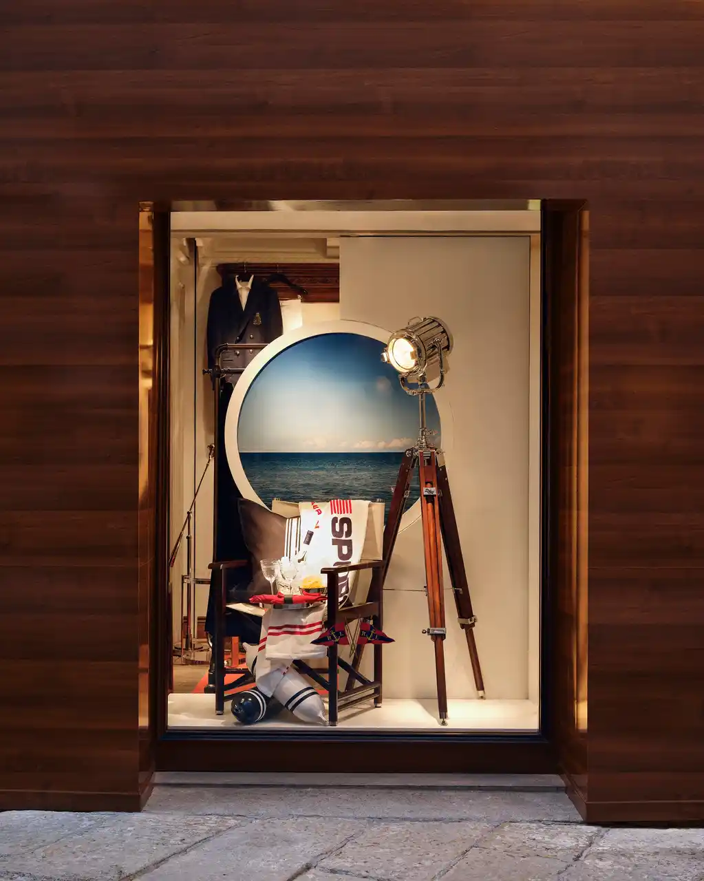 海での自由な生き方とタイムレスなスタイルを讃えるラルフ ローレンは、ミラノ デザインウィーク開催期間中、ミラノ・スピーガ通りの旗艦店において、スポーツとスタイルが織りなす没入型の世界観を表現します。風にはためく帆と磨き上げられたチーク材が形づくるエレガントなヨットの毅然とした精神が、ストアのファサードを一新させ、ストア ウィンドウはあたかも船の舷窓から外を眺めているかのような気分にさせるのです。この見事な変貌は、訪れる人々を、航海のヘリテージと現代的なエレガンスが出会う海岸沿いの隠れ家へと誘います。 |