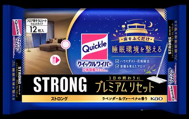 花王「クイックル」から、2026年4月11日に新たに発売した『クイックルワイパー 立体吸着ウエットシート ストロング プレミアムリセット』は、床をふくだけで、睡眠中に気になるハウスダストや花粉を除去し、安眠を考えたアロマの香りが空間を満たすことで睡眠環境を整えるフロア用ウエットシート。『クイックルワイパー』は静かにそうじができるので、眠る前の“夜そうじ”にぴったりです。 |