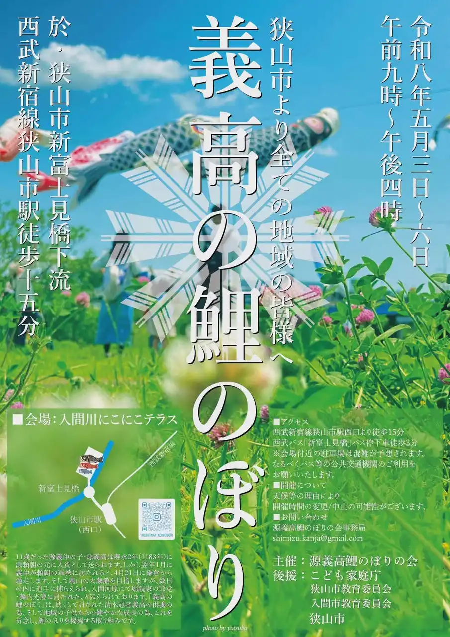 平成26年度に狭山市の入間川地区のまちづくり事業として市民が発起して実施を開始(以降3年間、市から事業補助を受け、平成29年度より補助を受けずに自主財源で実施)。令和2年、3年とコロナ禍のため中止としたが、35,000人(令和7年実績)が集まるイベントとして、世間に翻弄され幼くして亡くなった伝承を子どもにちなみにこどもの成長を願う鯉のぼりに絡めイベントを実施しています。 |