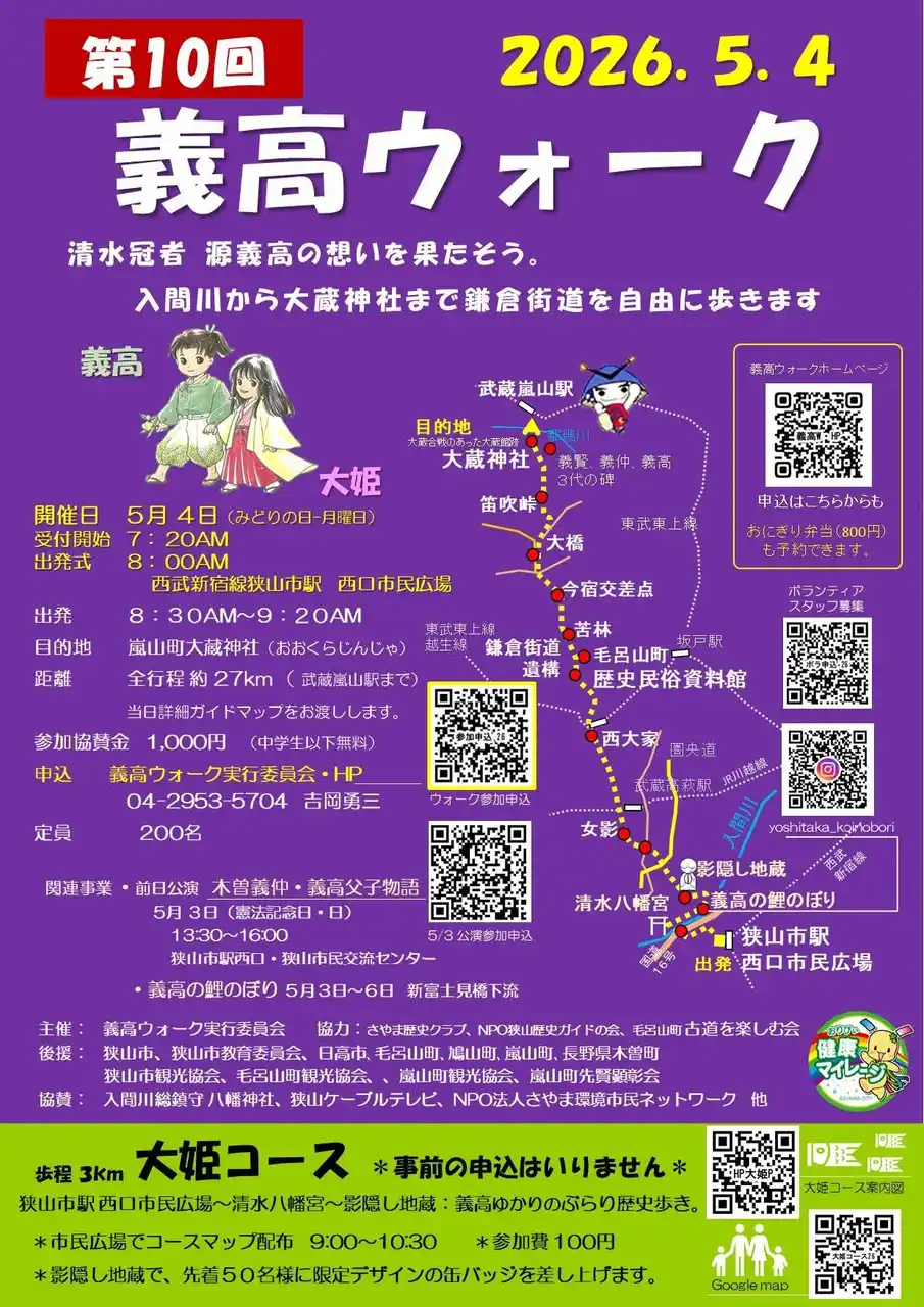 平成27年度に市民が発起して実施を開始。約170人(令和7年実績)が集まるイベントとして、入間河原で誅殺された義高公がめざした目的地大蔵館(嵐山町・大蔵神社)を目指す24キロのウォーキングイベント。 |