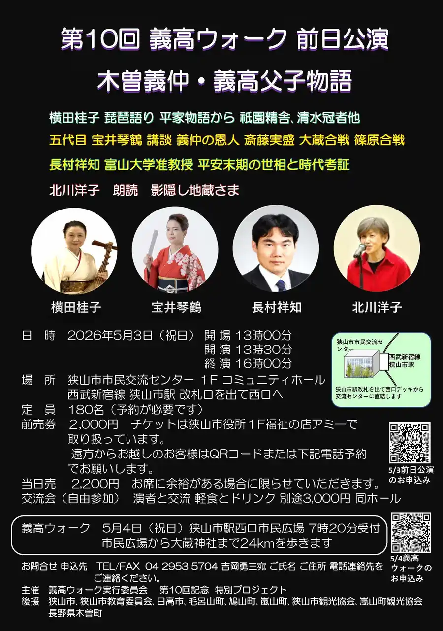 義高ウォークの10回開催を記念して行う公演。琵琶語り、講談、講演、朗読、様々な手法で義高公を表現します。 |