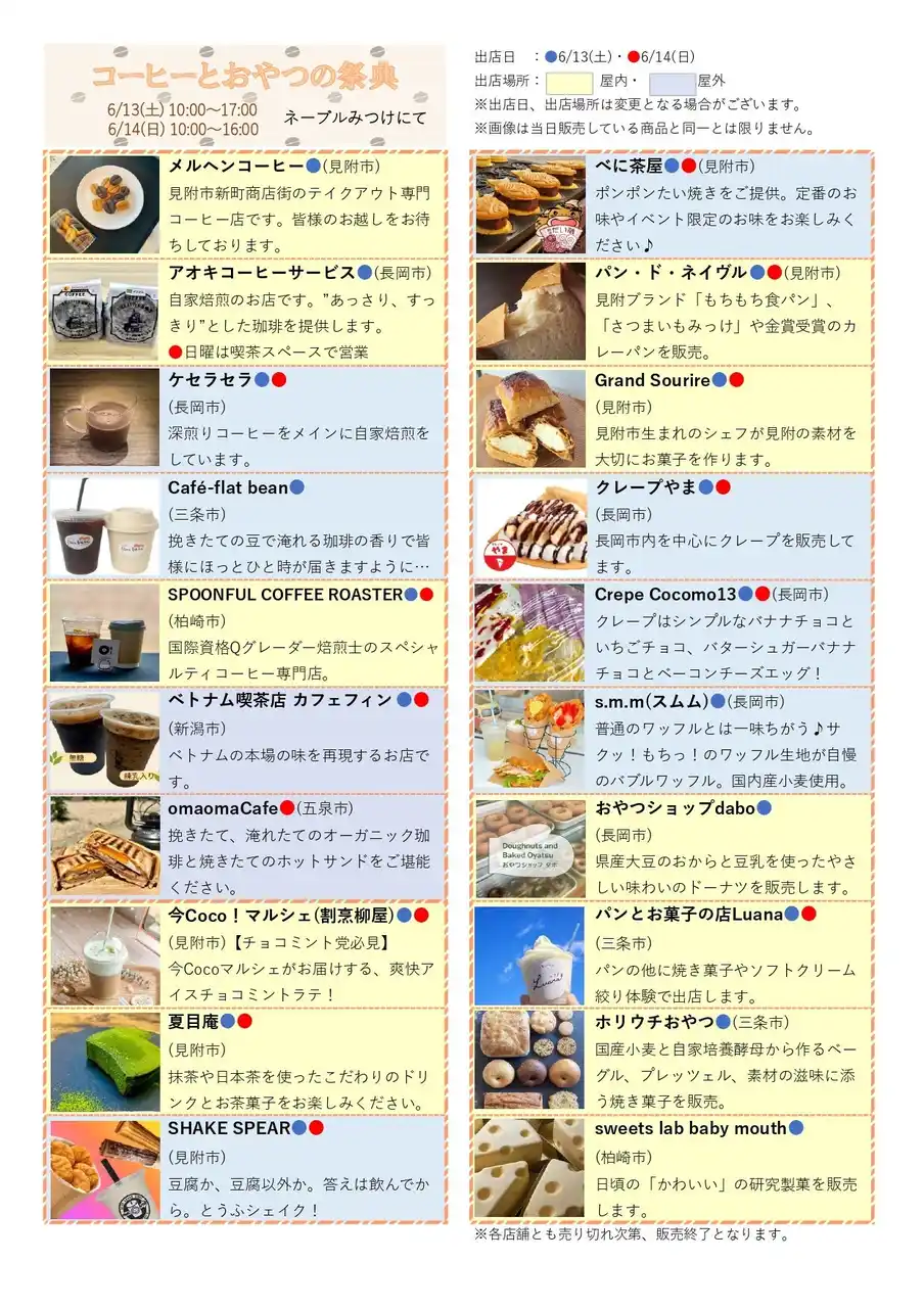 一般社団法人見附市観光物産協会は、2026年6月13日(土)・14日(日)の2日間、見附市の市民交流センター「ネーブルみつけ」にて「コーヒーとおやつの祭典」を開催します。見附市でコーヒーとスイーツに特化した飲食イベントは、今回が初開催です。 |