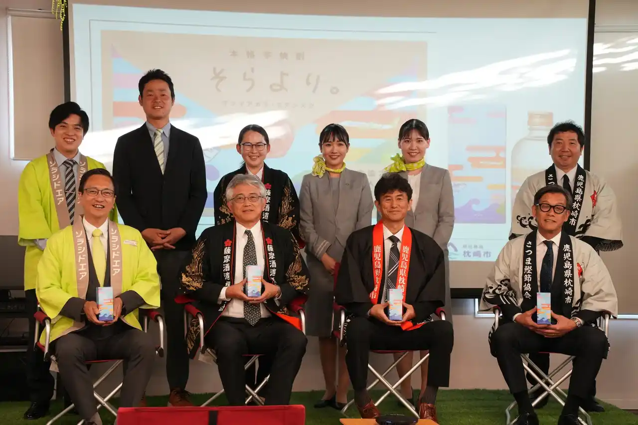 | 株式会社ソラシドエア(本社:宮崎県宮崎市 代表取締役社長:山岐 真作)、薩摩酒造株式会社(本社:鹿児島県枕崎市 代表取締役社長:吉元 義久)、一般社団法人地域商社推進機構(本社:鹿児島県枕崎市 代表理事:下竹 重則)、枕崎市(市長:前田 祝成)の4者はオリジナル芋焼酎 「 そらより。」 の完成を記念し、4月25日(土)・26日(日)に鹿児島空港にて販売記念イベントを開催します。また、6月からはソラシドエアの機内にて数量限定で販売を開始します。 | |||||||||||