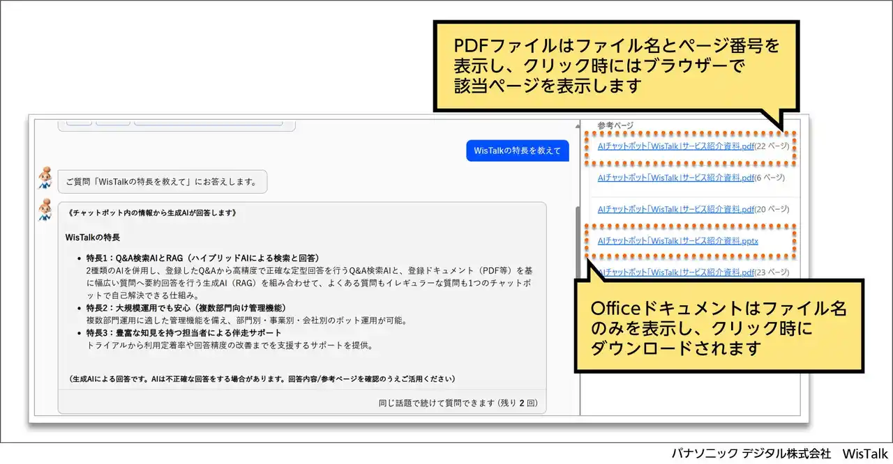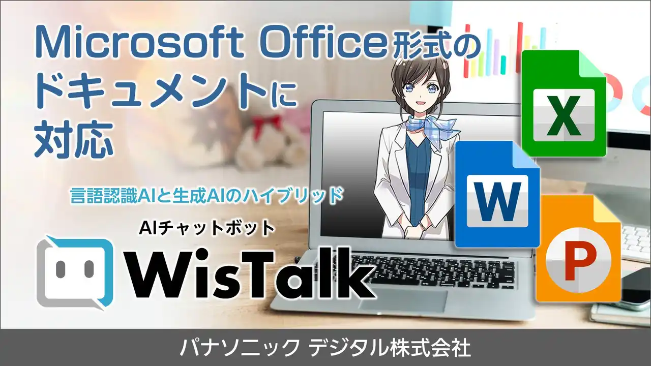 パナソニック デジタル株式会社(本社:大阪府、代表取締役 社長執行役員:阿部 裕)は、2026年5月にAIチャットボット「WisTalk」のバージョン13.2をリリースします。これまで、生成AI自動回答機能(RAG)の回答の元となるドキュメントのファイル形式は、PDFに限定されていました。この度のバージョンアップでMicrosoft Office形式のドキュメント(Word、Excel、PowerPoint)の登録が可能となり、都度行っていたPDFファイル形式への変換作業が不要になります。既存ドキュメントをそのまま活用することで、生成AI(RAG)の管理・更新作業の効率化を支援します。 |