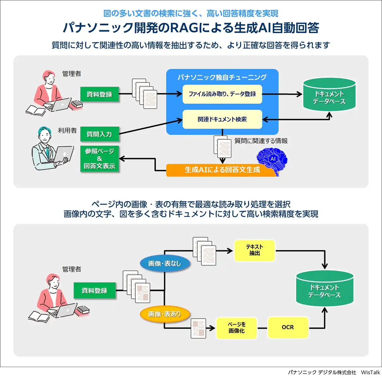 パナソニック独自のチューニングのRAGを採用した言語認識AIと生成AIのハイブリッドチャットボット「WisTalk」は、これまでユーザーの声を中心にバージョンアップを重ねてまいりました。身近で・使いやすい自然な会話形式を実現する「マルチターン会話」や、複数部門向けの管理機能、プラットフォーム連携などの便利機能で主に「社内問い合わせ対応」や「ナレッジ活用」のDX推進を支援しています。 |