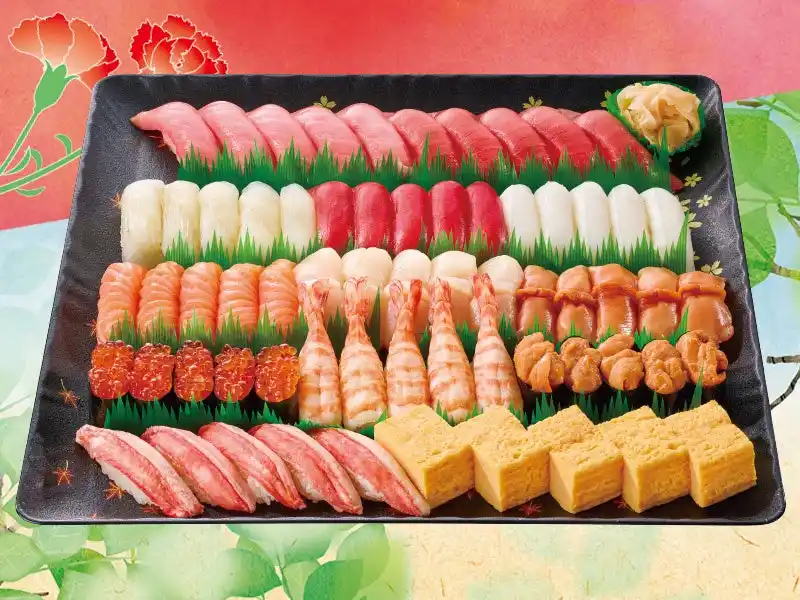 また、母の日限定メニューとして5月9日(土)・10日(日)の2日間限定で、うにやずわいがになどの豪華なネタを盛り込んだ「感謝(かんしゃ)」も販売いたします。こちらの商品も5人前・3人前・1人前がございます。 |