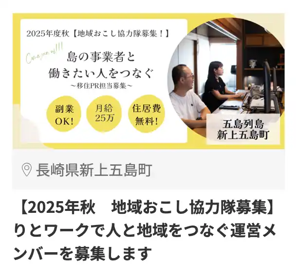・️島の事業者と移住者の橋渡しとなるコーディネーター業務や、地域の魅力・移住情報を発信する地域おこし協力隊の募集。未経験者歓迎、副業OK、住居費無料が多くの関心をつかんだ。 |
