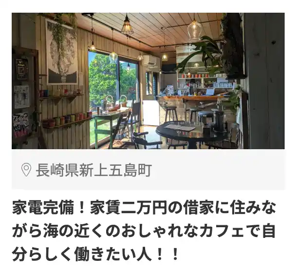 ・家電完備!家賃二万円の借家に住みながら海の近くのおしゃれなカフェで自分らしく働きたい人!!(興味ある数:366件) |