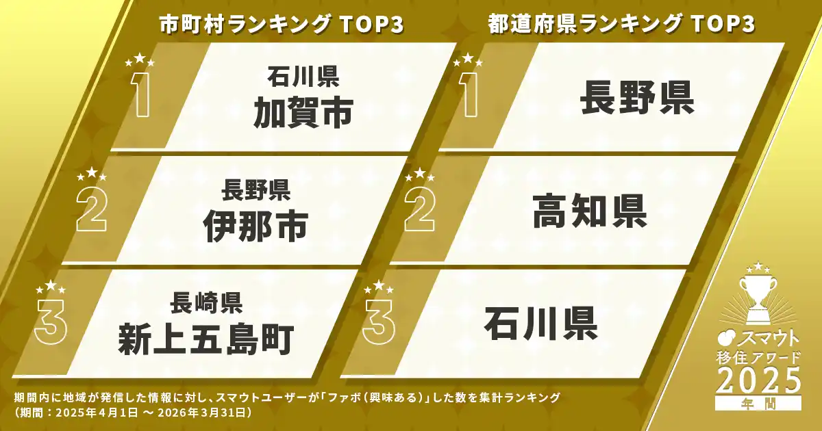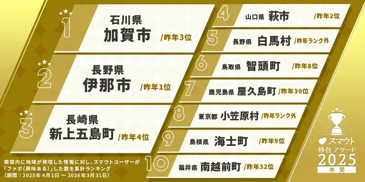 株式会社カヤック(本社:神奈川県鎌倉市、代表取締役CEO:柳澤大輔)は、自社が運営する地域とつながるプラットフォーム「スマウト」において、移住希望者の興味・関心を集める人気地域をランキング化した「スマウト移住アワード2025」を、4月21日(火)に発表しました。 |