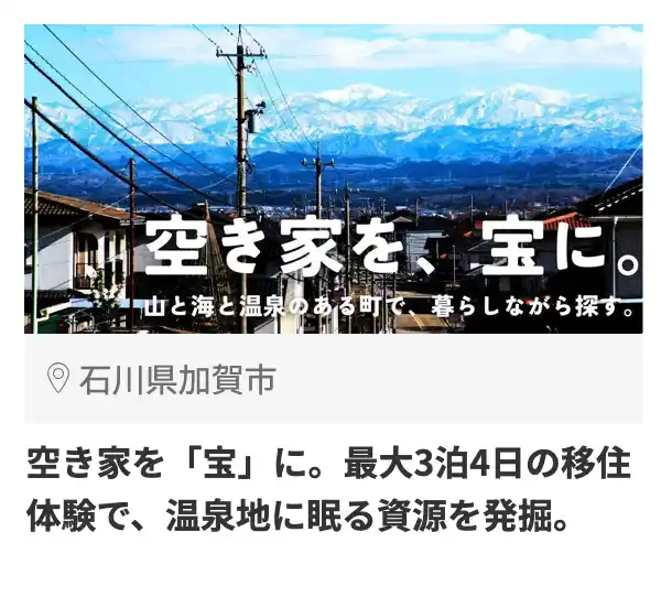 ・️山・海・温泉が揃う加賀市で、最大3泊4日の無料お試し住宅に滞在しながら「空き家」の活用を構想するプログラムに注目。空き家を住まいや事業拠点としての「宝」と捉えて、自分らしい利活用を探れる点が多くの共感を集めた。 |