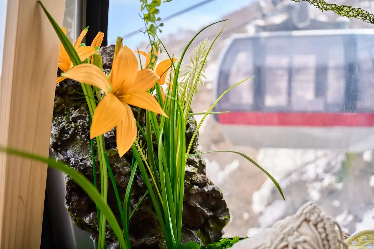 谷川岳ヨッホの22人乗りゴンドラは国内でも3台のみで、他のゴンドラと比べてゆったりとくつろげるのが特徴です。ゴンドラの一部が、期間限定で特別な「ボタニカルゴンドラ」に変身します。車内はアーティフィシャルフラワー作家・GEOCOLORによる精巧な高山植物を模した作品を展示します。開花時期や場所が異なる高山植物を、ボタニカルゴンドラでは一度に眺めることができるのも醍醐味です。さらに、カーテンやクッション、ランチョンマットに至るまで植物をモチーフとした装飾を施しました。