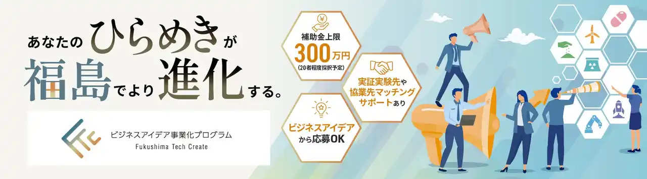| 福島県浜通り地域等15市町村(以下、福島イノベ地域)で技術シーズの事業化を目指す「Fukushima Tech Create(FTC) ビジネスアイデア事業化プログラム」(委託元:公益財団法人福島イノベーション・コースト構想推進機構 以下、福島イノベ機構)の運営を受託した株式会社ツクリエ(本社:東京都千代田区、代表取締役:鈴木英樹 以下、ツクリエ)は、4月17日(金)より本プログラムのエントリーの受付を開始しました。 | |||||||||||