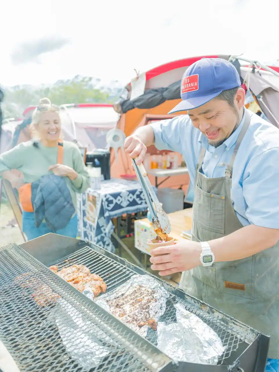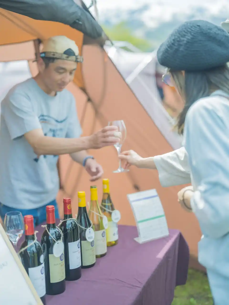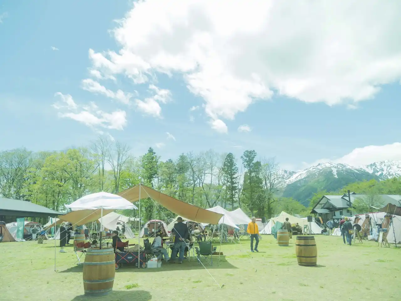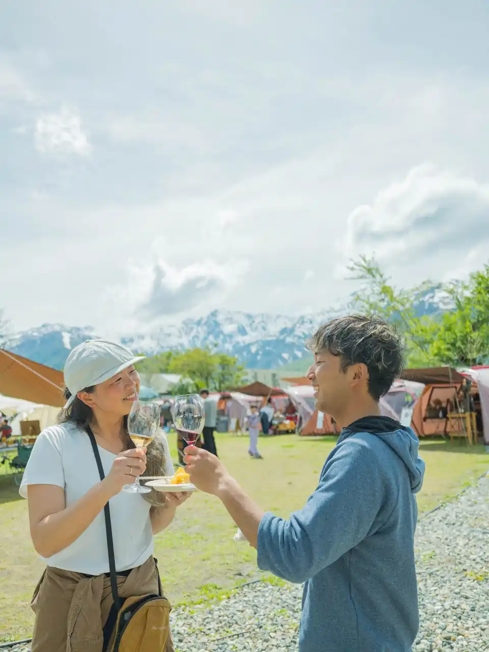 | 会場は「Snow Peak Land Station HAKUBA」。芝生に広がる開放的な空間と雪解けの北アルプスの景色の中で、長野県のワインを気軽に楽しめます。 | ||||||||||||||
