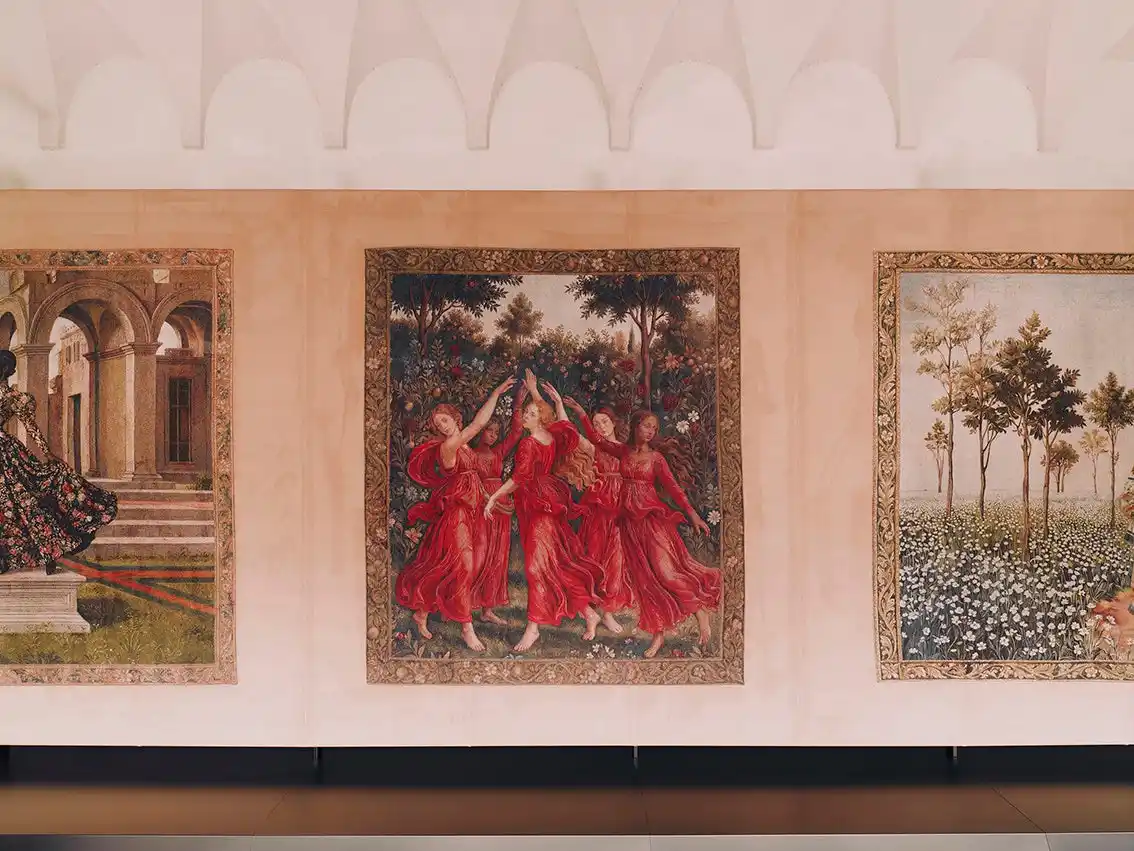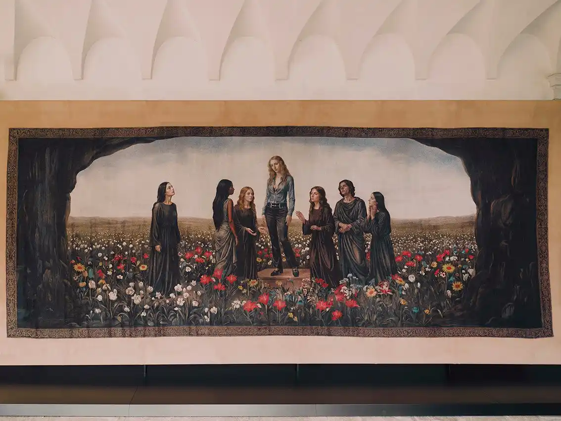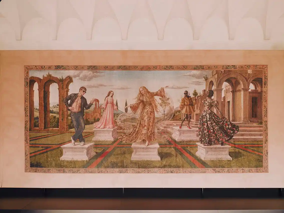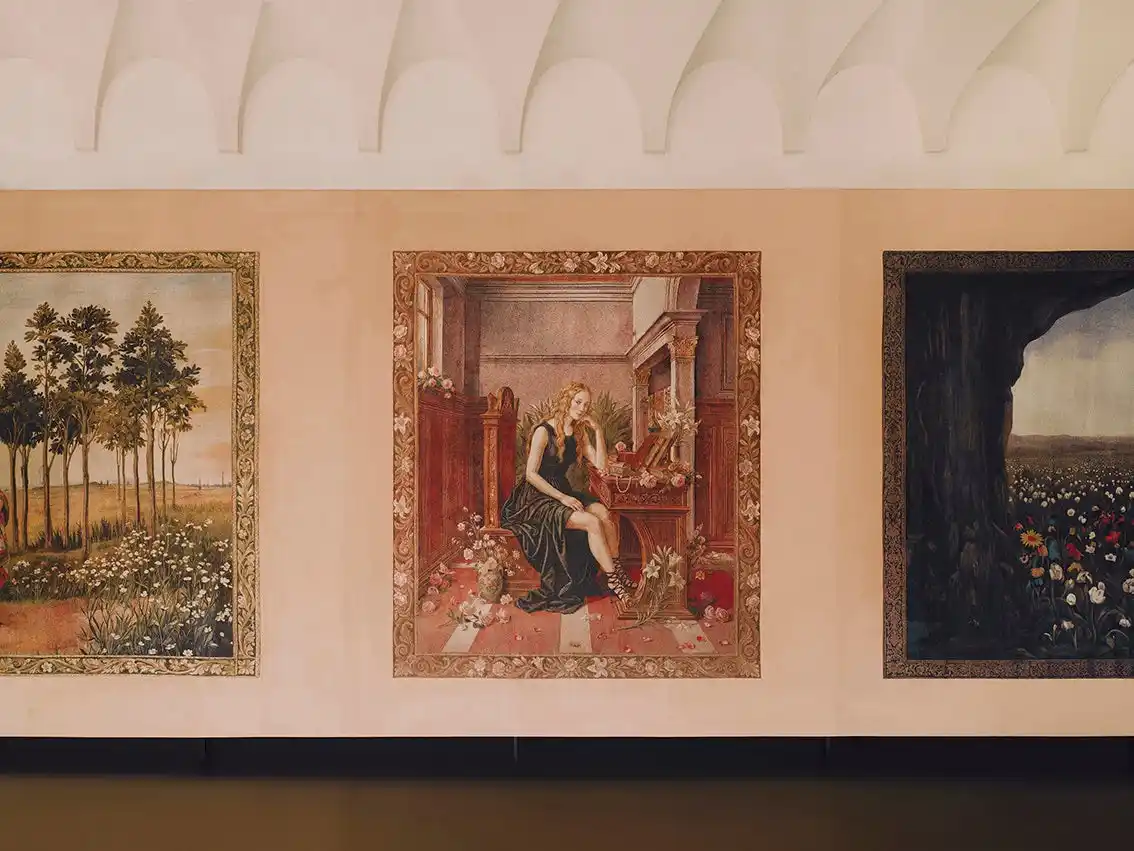 各タペストリーは、構図や色彩、空気感の変化によって、神話的な起源から現代的な再解釈へと移ろう流れを視覚化。人物やシンボル、風景が連なりながら変容することで、進化し続けるグッチの姿を映し出します。 |