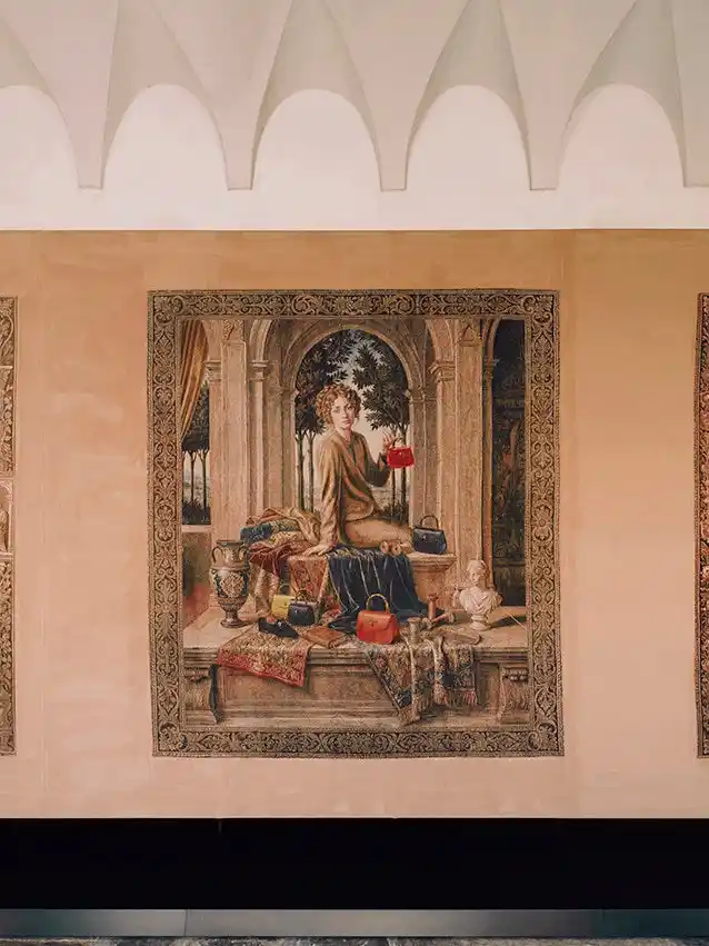 続く章では、〔グッチ ジャッキー 1961〕や〔グッチ バンブー 1947〕といったアイコニックなハンドバッグの登場に加え、トム・フォード、フリーダ・ジャンニーニ、アレッサンドロ・ミケーレ、サバト・デ・サルノといった歴代クリエイティブ・ディレクターによる革新的なビジョンから、ブランドを進化させてきた創造の時代が映し出されます。そして物語は現在へと至り、最後のタペストリーでは、デムナのもとで始動した新たなクリエイティブの方向性が示され、クラフツマンシップ、実験精神、チームの創造性が交差するスタジオの情景へと回帰します。 |