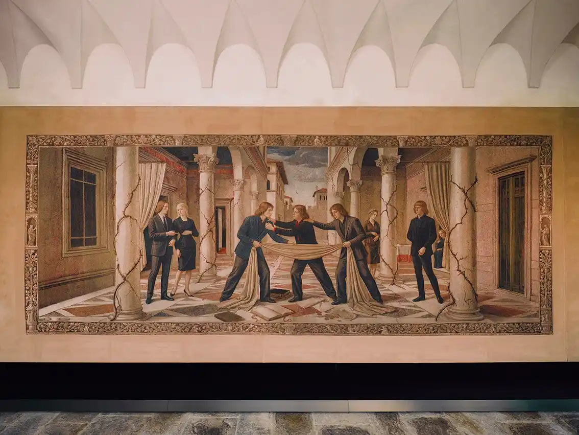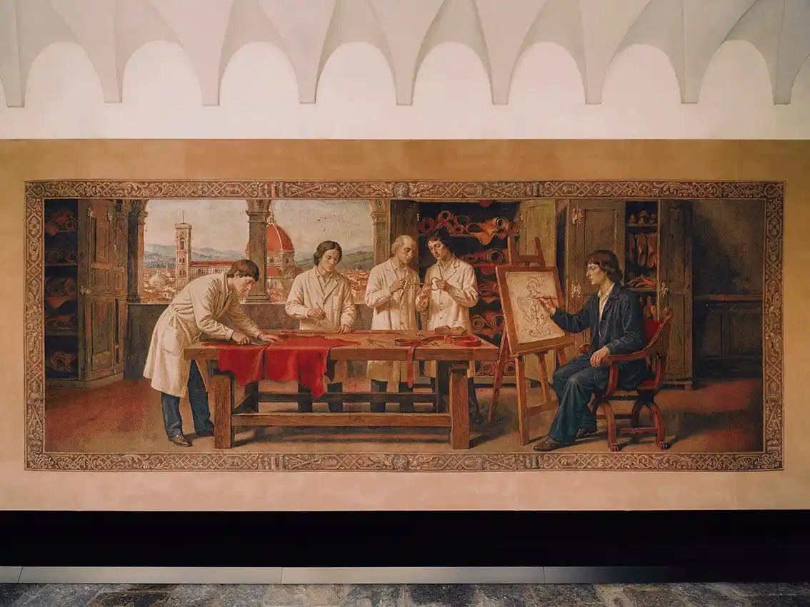 第2のシーンでは、インスピレーションが形となって現れます。ブランド創設の地フィレンツェのルンガルノ・グイッチャルディーニ通り11番地に構えた最初のグッチの工房で、職人たちが仕事に打ち込む姿が描かれています。道具やレザーに囲まれた空間で、トスカーナの都を背景にグッチのヴィジョンが具現化されていきます。1955年、「グッチ クレスト(Gucci crest)」の商標登録を機に、グッチの神話が形を成し始めます。このタペストリーには、その瞬間がアーティストのキャンバスに描かれたスケッチとして表現されています。 |