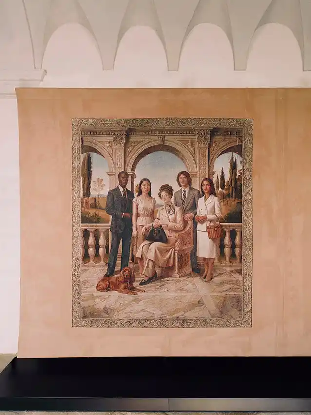 「Gucci Memoria」の中心を成すのは、ブランドの歩みを視覚的に表現した12点のタペストリーです。フィレンツェの伝統的な織物技術を背景に制作されたこれらの作品は、グッチの歴史における象徴的な瞬間を、緻密で重厚なタブローとして昇華させています。物語は、若き日のグッチオ・グッチがロンドンのホテル ザ・サヴォイで過ごしたブランドの原点となる日々から始まり、フィレンツェでの最初の工房の誕生、デザインコードの確立、そして国際的なラグジュアリーブランドへと発展する軌跡を辿ります。 |