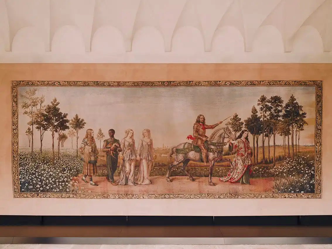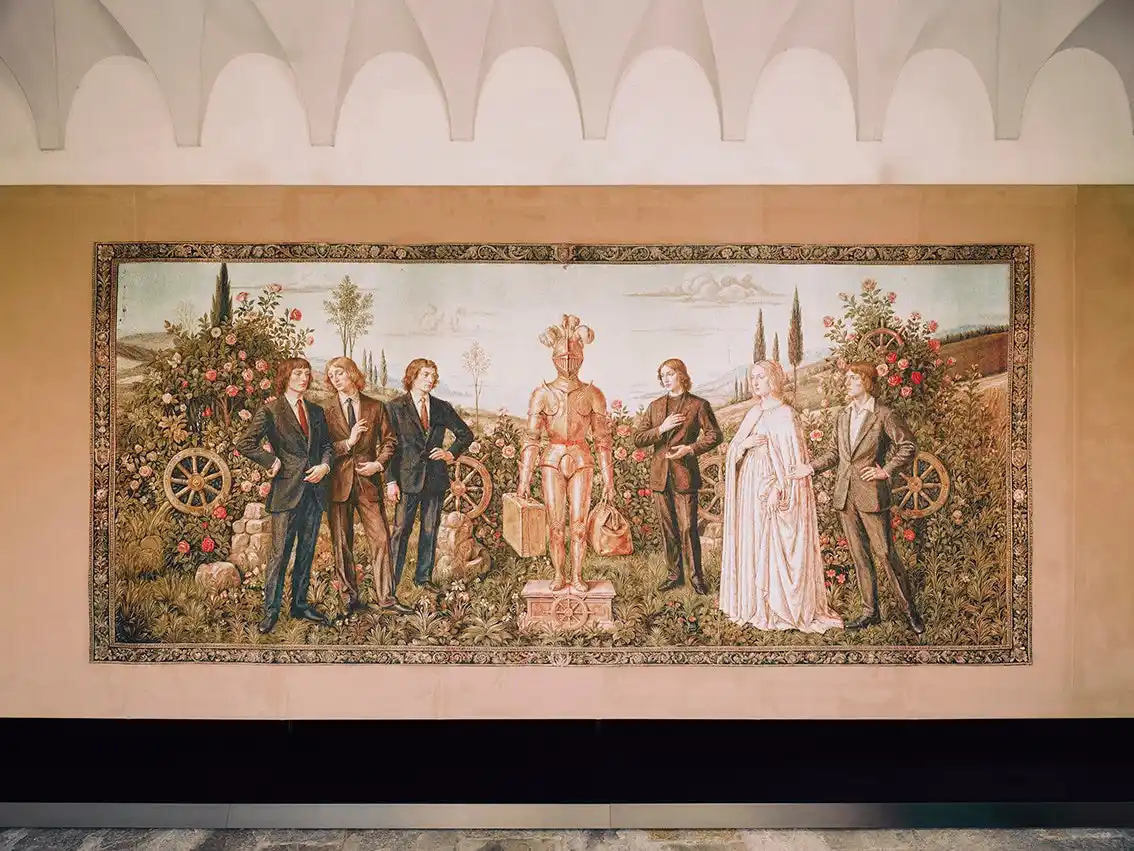第3のタブローは、家族経営のレザーグッズおよびラゲージ ショップとして始まったグッチが、ジェットセッターやハリウッドスターに愛される国際的なブランドへと成長していく様子が描かれています。前のタペストリーに登場した「グッチ クレスト」は、黄金の鎧をまとった騎士へと姿を変え、両腕にラゲージを抱えています。トスカーナの丘陵と花々に彩られたこのタペストリーは、ブランドのルーツを想起させると同時に、その世界的な発展を描き出しています。 |