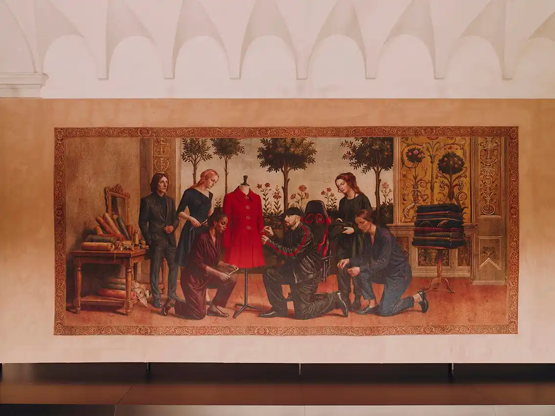 最終章となるタペストリーでは、視線を再びグッチのスタジオへと戻し、ブランドのすべてのクリエイションを支えるクラフツマンシップの芸術性に焦点を当てています。デムナとそのチームが「La Famiglia」コレクションを象徴する鮮やかなレッドのコートの前に集まっています。デムナの背後に置かれたゲーミングチェアが、伝統的な空間の中に意外性をもたらし、過去と現在の対話を物語っています。 |