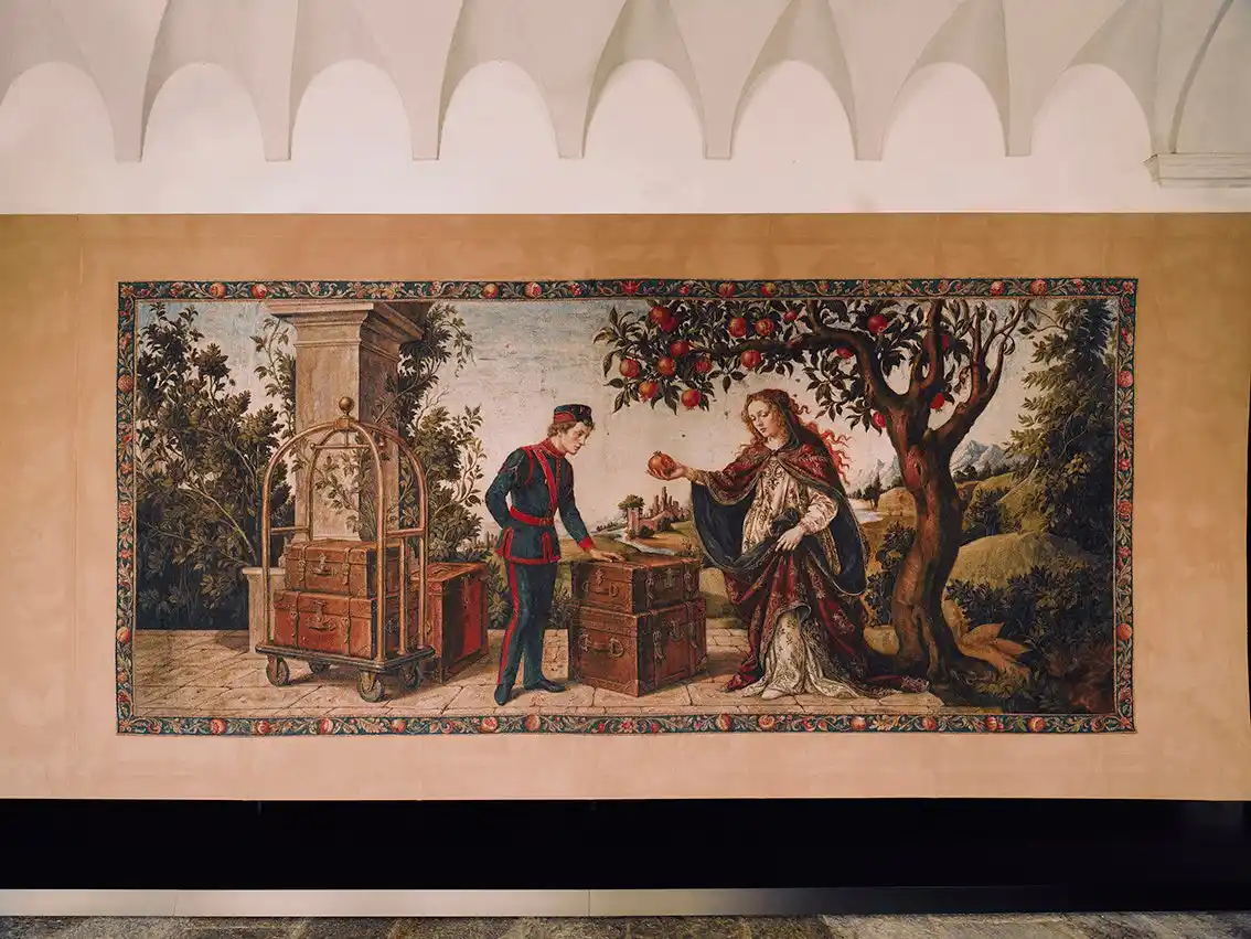 最初のタペストリーは、ブランド創設前の時代へと遡ります。ここには、若き日のグッチオ・グッチがポーターの制服に身を包み、ロンドンのホテル ザ・サヴォイで経験を重ねていた日々が描かれています。すべての始まりとされるこの都市での体験から、のちに世界的なラゲージブランドとして名をはせるグッチの最初のインスピレーションが生まれたのです。 |