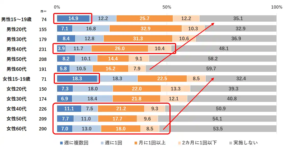 性年代別に見てみると、若い世代ほど頻度が高い傾向にあり、10代では「週に複数回」という高頻度層が男女ともに約15~18%いました。また、若い世代だけでなく、“健康が気になるお年頃”の40~60代も約30~40%の人が「月に1回以上」、特に女性の方が高い頻度で意識的にギルティ消費を行っていることがわかりました。【図表2】 |