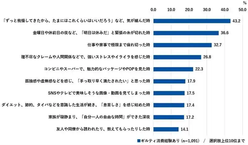 1位は「ずっと我慢してきたから、たまにはいいだろうと気が緩んだ時(43.2%)」、次いで「金曜日や休前日の夜など、明日は休みだと緊張の糸が切れた時(36.6%)」、「極限まで疲れ切った時(32.7%)」と続きました。日々の節約やタイパ重視の生活による“我慢の限界”が引き金となっているようです。【図表7】 |