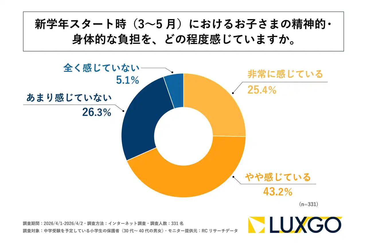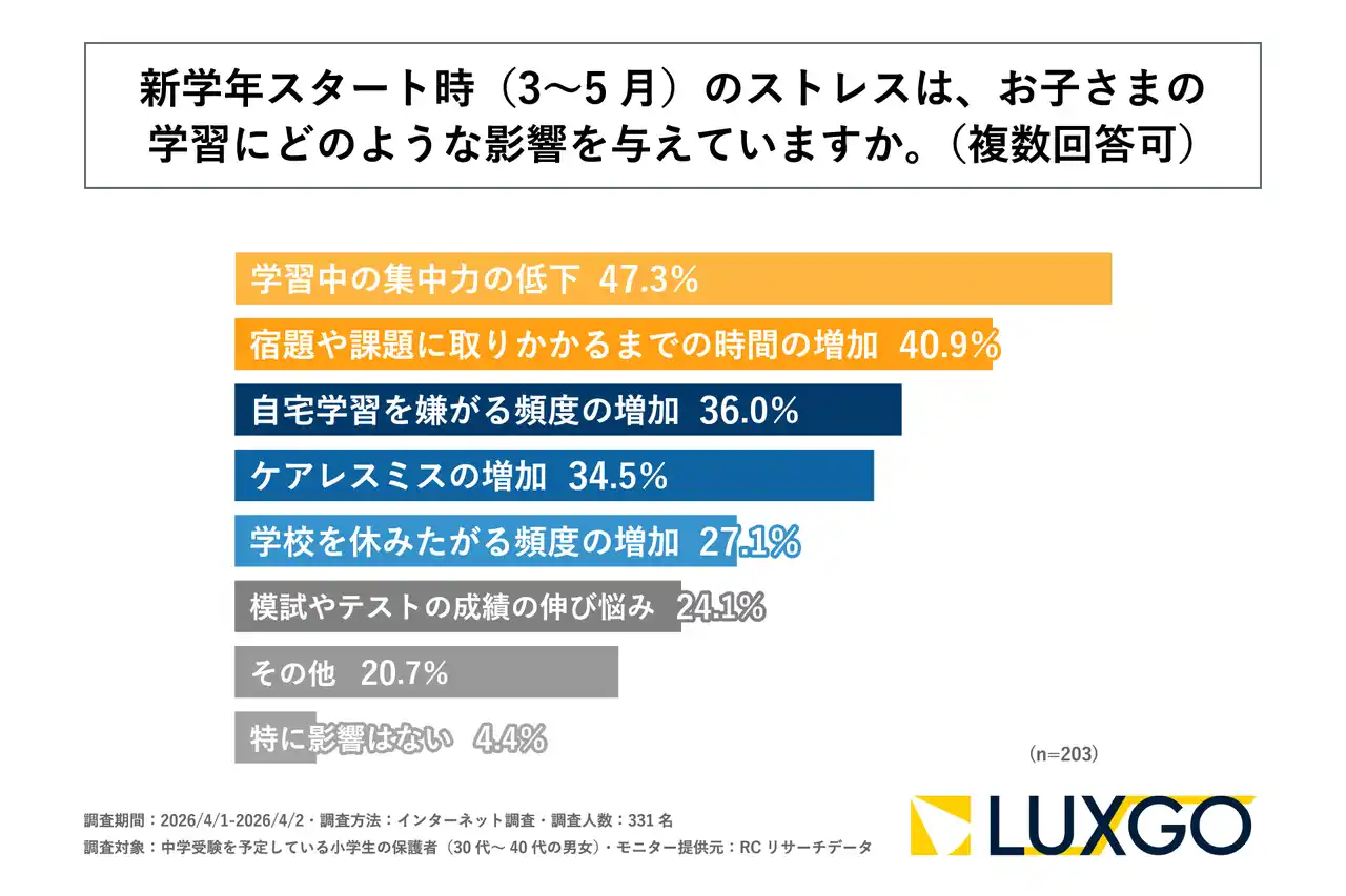 LUXGO株式会社(ルクスゴー株式会社、本社:東京都台東区、代表取締役:中川 慶悟)が運営する「Kidsプログラミングラボ 秋葉原教室」は、中学受験を予定している小学生の保護者(30代~40代の男女)を対象に「中学受験家庭の新学年ストレスに関する調査」を実施しました。この調査から、中学受験を予定している小学生の保護者が感じる、子どもの新学年スタート時の精神的・身体的な負担の実態や、そのストレスが学習に与える影響などが明らかになりました。