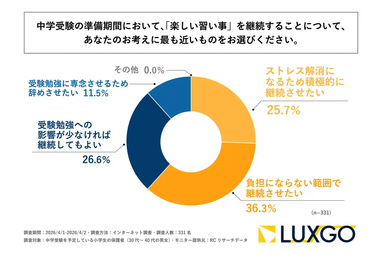 ・中学受験を予定している小学生の保護者の6割以上が、受験の準備期間において、「楽しい習い事」を「負担にならない範囲で継続させたい」または「ストレス解消になるため積極的に継続させたい」と考えている |