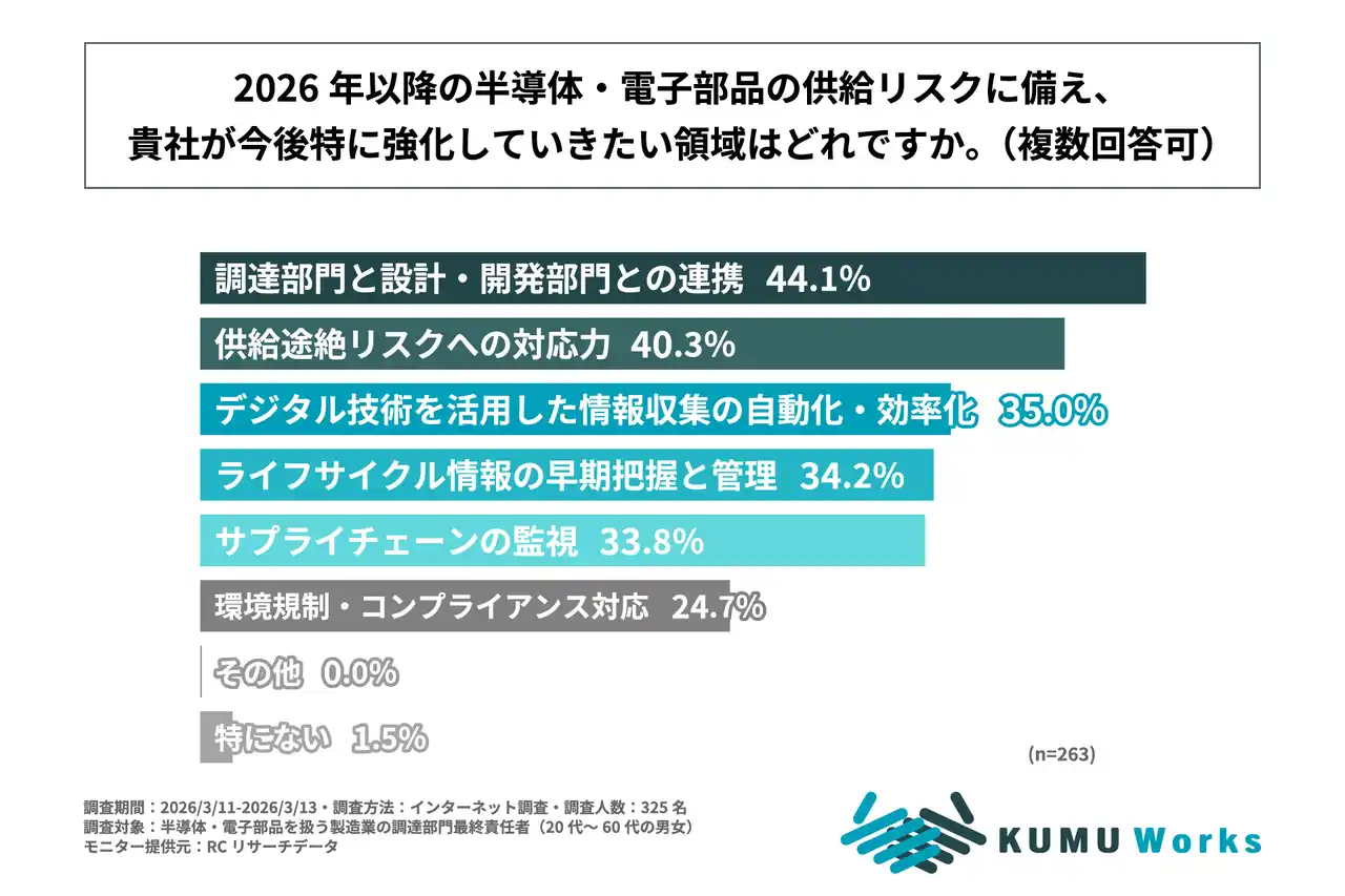 2026年以降の半導体・電子部品供給に不安やリスクを感じている製造業の調達部門が、そのリスクに備えて今後自社で特に強化していきたい領域は「調達部門と設計・開発部門との連携」や「供給途絶リスクへの対応力」 |