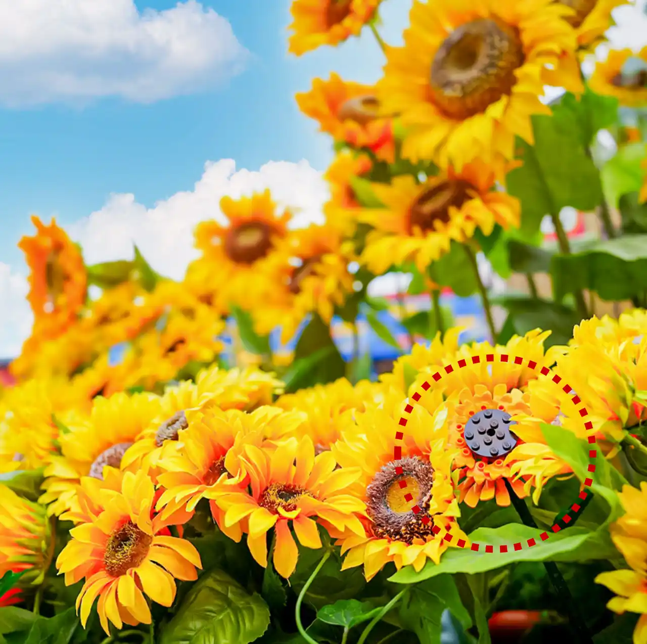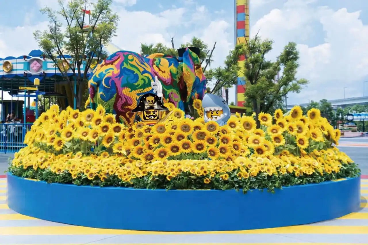 エントランスを抜けると、目の前には夏の思い出を彩るたくさんの「ひまわり」がお出迎え。そのひまわりの中にはレゴ(R) ブロックで作られた特別なひまわりが隠れています。 |
